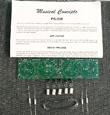 PS-509 Kit includes PCB with all mounting hardware, 8 Power capacitors of your choice, 2 bridge power rectifiers, 4 large resistors for CRC, 4 bleeder resistors, additional resistor to send power to on/off LED, instructions.