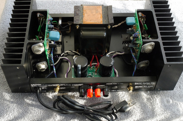 So puny! No wonder we made the other picture look bigger. Well it’s actually bigger because it has 15,000uF/80V ‘Premium’ caps of the standard PS-100 version. The amp above has the PS-100SE with two 10,000uF/80V caps, but you know what, this PS-100SE power supply is equal in capacitance to the original power supply. The 80’s era Hafler DH-200 had a pretty competent power supply considering its original price and market position. The PS-100 caps are rated at 80V as opposed to the 75V caps of the original increasing the safety margin. Modern caps are such great performers even with these modest physical packages. It also has an outstanding power rectifier that is vastly better sounding than the original. It’s lying flat for heatsinking purposes between the transformer and the PS-100 board under those two red wires(see DH-200 picture above). Think of the PS-100SE as a ‘restoration’ on steroids. Yes, our PS-100SE/DH-200 above is a major sonic upgrade even though it’s the most affordable of our PS series of power supply boards. Ignore the size, embrace the sound!