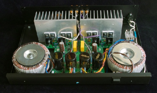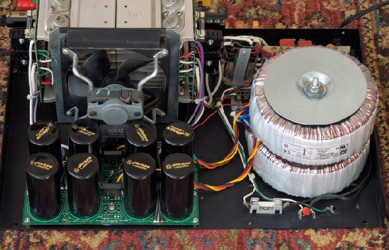 Just to the left of the power transformer you see the Ixys Hyper-Fred rectifier. Then there are the multiple bypass caps on the main power cans.