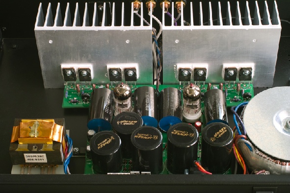 HERE IS A LOOK INSIDE OF A NEW MUSICAL DESIGN HYBRID AMPLIFIER.............. It sounds just too natural to believe. Be prepared for a level of detail and an acoustic envelope that is truly breathtaking. A few details: You see a pair of NOS 6922 tubes operating at 250VDC, but you can use the 6N1P, 6DJ8, ECC88, 7308 and the other 6DJ8 variants. Those are MOSFET outputs you see on the heatsinks. You are also looking at an incredibly simple SRPP front-end with no feedback!!! You see it here installed into the Musical Design D-75/DM-100 chassis which the amplifiers will share. We rate it at 100W/CH. A less powerful 75W/CH version is available too for use with efficient speakers and bi-amping. The 100W version has four MOSFETs per channel, larger heatsinks and taller chassis. This is our all-out version with Jensen filter caps for all except heater voltages. Our Platinum grade resistors are used in most positions. You see the Audience Aura-T Teflon coupling capacitor used in coupling applications. Some of you will notice the little red BlackGate cap there and Cardas connectors on the back. Our T-100 Elite Ultra model is $4495.